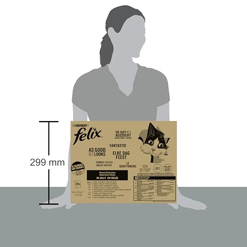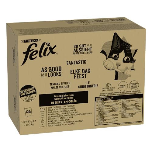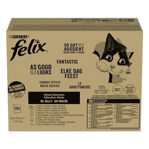 Felix | Tendres Effilés | Aliment Complet pour Chat Adulte| Sélection Mixte : Au Boeuf, Au Poulet, Au Saumon, Au Thon| en Gelée | Portion Individuelle | 120x85g