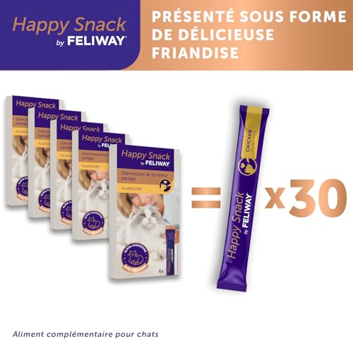 Happy Snack by FELIWAY – Pack de 5 boites – Friandise Onctueuse Relaxante pour Chat – Appréciée par 86% des Chats – sans Somnolence – Au Poulet – 30 Sticks de 15g