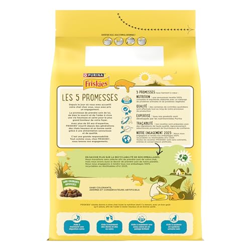 Les 5 Promesses FRISKIES®. Depuis le jour où vous avez accueilli votre chat chez vous, vous avez pris un engagement. La promesse de prendre soin de lui, de bien le nourrir et de l’aider à vivre une vie heureuse et saine pour le plus grand bonheur de votre foyer. Avec plus de 50 ans d’expertise, FRISKIES® nourrit depuis des générations des chats heureux et en bonne santé grâce à une alimentation savoureuse et de qualité. C’est une grande responsabilité. Tout comme vous, chez FRISKIES®, nous tenons nos engagements et 5 promesses nous tiennent à cœur : – Nutrition : une savoureuse recette 100% complète et équilibrée, élaborée avec un mélange de protéines animales et de protéines végétales – Qualité : des centaines de contrôles quotidiens sont effectués tout au long de notre processus de production – Expertise : tous nos produits sont développés par les nutritionnistes Purina – Traçabilité : nos recettes sont préparées avec des ingrédients de haute qualité, rigoureusement sélectionnés provenant de fournisseurs de confiance – Notre engagement 2025 : Nous nous engageons à rendre nos emballages 100% recyclables ou réutilisables d’ici 2025 Toutes les recettes FRISKIES® sont sans colorants, arômes et conservateurs artificiels.