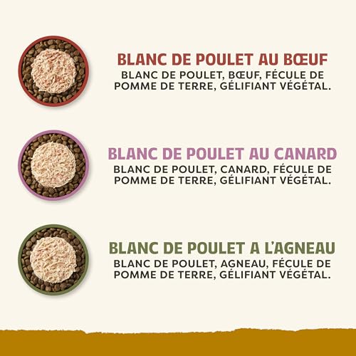 Chicken with Duck in Gravy (Chicken Breast 45%, Duck 5%, Vegetable Gelling Agent, Potato Starch). Chicken with Beef in Gravy (Chicken Breast 45%, Beef 5%, Vegetable Gelling Agent, Potato Starch). Chicken with Lamb in Gravy (Chicken Breast 45%, Lamb 5%, Vegetable Gelling Agent, Potato Starch).