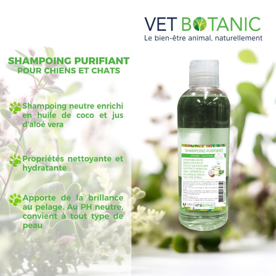 Découvrez le shampoing purifiant Vet Botanic, spécialement conçu pour l’hygiène et le toilettage de vos chiens et chats. Sa formule douce, enrichie en huile de coco, apporte vitamines A et E ainsi que l’acide laurique pour nourrir et lisser le pelage. L’hydrolat de citron et l’huile essentielle de lavande confèrent des propriétés assainissantes naturelles tout en laissant une agréable fragrance qui aide à éloigner naturellement les insectes. Sans résine ni silicone, ce shampoing au pH neutre est idéal pour un usage régulier. Sa base lavante non agressive, combinée au jus d’aloe vera, nettoie et hydrate la peau tout en donnant brillance et vitalité au pelage. Disponible en format 250ml, il convient à tous les types de peau et peut être utilisé fréquemment pour maintenir une hygiène optimale de votre animal de compagnie.