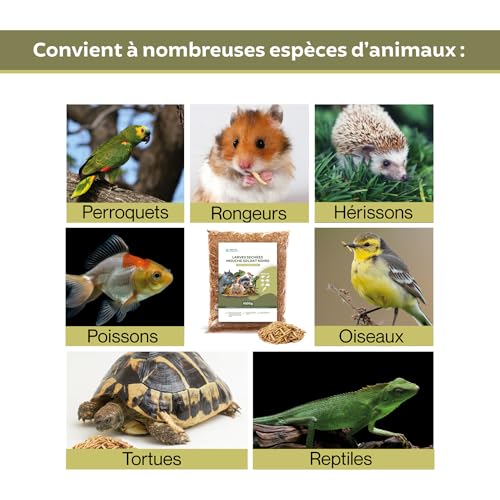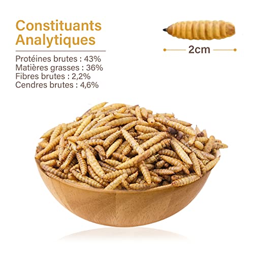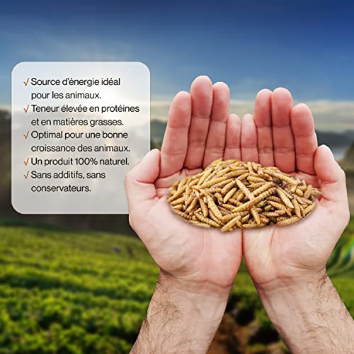🐠 PROPRIÉTÉS : Les larves, du même que les vers de farine déshydratés, constituent une alimentation de premier choix ! Elles apportent des précieuses protéines et des acides aminés qui favorisent la bonne santé de vos animaux – Avec plus de 40 % de protéines et les nombreuses vitamines, les larves de mouche soldat séchées sont une vraie source d’énergie
