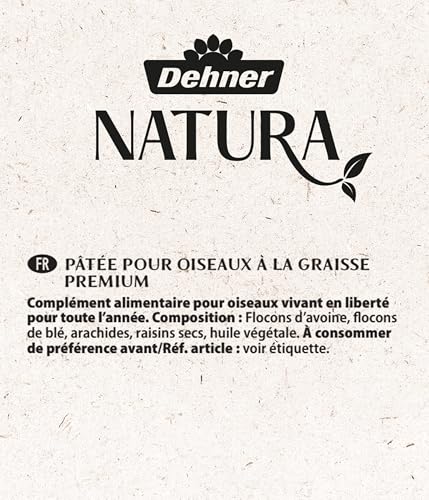 Une source de force et d’énergie pour vos oiseaux : Aliment gras Dehner Natura Premium Tous les nutriments essentiels, haute teneur en graisses végétales, plus de 10 % d’arachides C’est surtout pendant les mois d’hiver que les oiseaux sauvages ont besoin de notre aide pour trouver leur nourriture. Avec l’aliment gras Dehner Natura Premium, vous aidez les oiseaux sauvages à s’alimenter tout au long de l’année. Ce mélange unique de nourriture apporte à vos oiseaux tous les nutriments essentiels pour leur santé. Grâce à sa très forte teneur en huile, notre aliment gras Dehner Natura Premium est une source d’énergie particulièrement appréciée. Pour bien commencer la journée Avec notre aliment gras Dehner Natura Premium, les oiseaux de votre jardin reçoivent tous les nutriments essentiels. Les 10 % d’arachides ont une teneur très élevée en graisses végétales et apportent ainsi un regain d’énergie particulier. Pour plus de goût, l’aliment gras Dehner Natura Premium contient également de délicieux raisins secs. Ces derniers constituent en outre un élément important de l’alimentation des oiseaux mangeurs de baies, comme les merles. Pour que les oiseaux sauvages omnivores puissent également profiter de l’aliment gras Dehner Natura Premium, celui-ci contient aussi des flocons de blé et d’avoine mous. La composition harmonisée et unique de l’aliment gras Dehner Natura Premium en fait une source de force et d’énergie unique qui fournit à vos oiseaux tout ce dont ils ont besoin pour bien commencer la journée pendant toute l’année. Complément alimentaire Composition : flocons d’avoine, flocons de blé, arachides, raisins secs, huile végétale