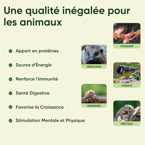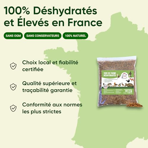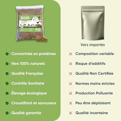 🇫🇷 QUALITÉ FRANÇAISE SUPÉRIEURE : Nos vers de farine sont élevés et transformés en France, garantissant une traçabilité totale et une qualité irréprochable. Nous respectons les normes sanitaires les plus strictes pour assurer la sécurité de vos animaux.