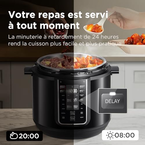 MINUTEUR INTELLIGENT : Avec une fonction de démarrage différé jusqu’à 24 heures, programmez vos recettes à l’avance et dégustez vos plats chauds à l’heure souhaitée.