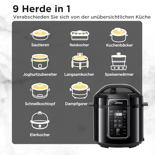 Midea Autocuiseur Électrique Rapide 9-en-1, 12 Programmes Prédéfinis, Multicuiseur Inox Instantané, Pot Antiadhésif, Yaourtière, Cuiseur de Riz, Cuisson Lente, Sauté, Vapeur, 6L, Noir