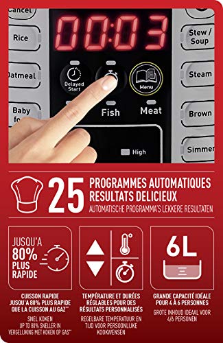Avec le multicuiseur haute pression Fast & Delicious de Téfal, cuisinez des plats délicieux pour toute la famille sans passer des heures en cuisine ! Ses 25 programmes automatiques, vous permettent de cuisiner simplement et rapidement une multitude de recettes de l’entrée au dessert. Ce multicuiseur haute pression, vous permet de cuire les aliments jusqu’à 80 % plus rapidement qu’une cuisson traditionnelle au gaz. Des nutriments préservés et des économises d’énergie. Cuisinez en toute sécurité, Fast & Delicious est équipé d’une technologie de pression sécurisée. Aucun contact avec la vapeur, pour une cuisson en toute tranquillité sans risque de brûlure.