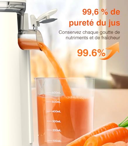 Technologie améliorée de presse à froid : ce presse-agrumes à froid dispose de 6 étapes avancées d’extraction en spirale, combinées à des dents de broyage innovantes composées ultra-fines de 0,1 mm pour garantir l’extraction du jus. Cela préserve les nutriments vitaux et les enzymes avec une finesse et une pureté améliorées, ce qui rend le jus optimal pour l’absorption. C’est un choix idéal pour les personnes soucieuses de leur santé.