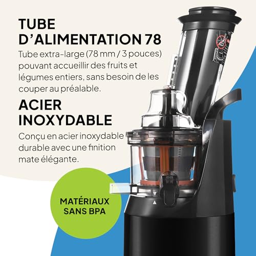 🍊 CONCEPTION MISE À JOUR – Puissant métal de 240 W en acier inoxydable noir mat facile à nettoyer avec grand tube d’alimentation inclinable de 75 mm pour AUCUN déchet Faciles à assembler, à utiliser et à nettoyer, les pièces 100% sûres sans BPA facilitent le nettoyage. Fonctionne silencieusement – moins de 60 décibels. L’acier inoxydable robuste et le corps robuste et stable vous garantissent un environnement calme et calme lors de l’extraction et un look incroyable dans votre cuisine.