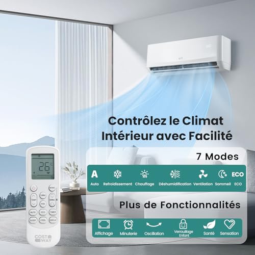 【7 Modes et Fonctions Complètes】Cette unité AC split permet de contrôler facilement le climat intérieur avec les modes auto, refroidissement rapide (en 30 secondes), chauffage (en 60 secondes), sec, ventilateur, sommeil et ECO. De plus, elle comprend un verrouillage enfant pour éviter les modifications accidentelles, un minuteur 24h pour une programmation flexible et d’autres fonctionnalités telles que l’affichage, l’oscillation, la fonction santé, I feel, etc.