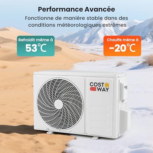 【Performance Avancée et Faible Bruit】L’unité extérieure haute performance fonctionne de manière stable même dans des conditions climatiques extrêmes, pouvant refroidir jusqu’à 53℃ et chauffer jusqu’à -20℃. L’unité intérieure offre un fonctionnement ultra-silencieux (22 dB) créant un environnement paisible. Les unités extérieures en acier galvanisé peuvent fonctionner à -15°C.