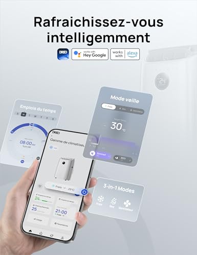 Spécification: Dreo Climatiseur portable 10 000 BTU pour chambre, refroidissement sans drainage, silencieux, contrôle par application/voix, minuterie 24h, avec ventilateur et déshumidificateur