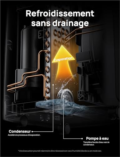 Sans drainage avec refroidissement puissant lorsque l’humidité est inférieure à 85 % : Apportez de l’air frais ininterrompu dans votre pièce. Grâce au nouveau design du climatiseur DREO, un condensateur spécial et une pompe à eau aident à transférer l’excès d’eau et réduisent le besoin de drainage par rapport aux climatiseurs traditionnels sur pied.