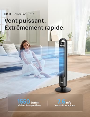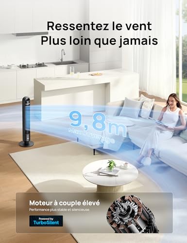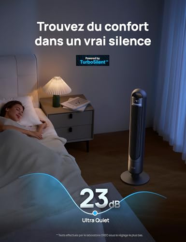 Dreo Ventilateur Colonne Silencieux 28 dB pour Chambre, Couverture Max 9 m, Ventilateur Debout sans Lame, 7,6 m/s, Oscillation 90°, 4 Vitesses, 3 Modes, Minuteur 8H, Affichage LED, Noir.