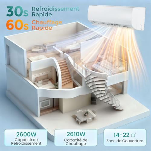 AIR PUR GARANTI & KIT COMPLET : Le climatiseur split dispose d’une fonction d’auto-nettoyage – à activer tous les 3 mois – et d’un filtre amovible et lavable, pour un air sain et frais en toute saison. De plus, tous les éléments nécessaires sont inclus. Veuillez lire attentivement le manuel avant l’installation.