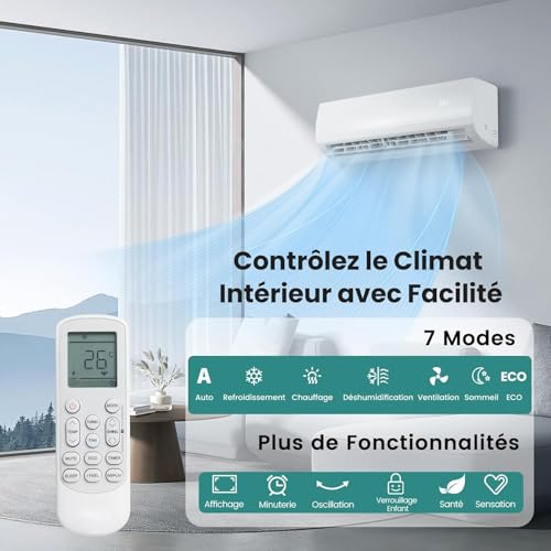 7 MODES TOUTE SAISON : Auto, Froid, Chaleur, Déshumidification, Ventilateur, Nuit et Éco. Adaptez facilement votre intérieur à chaque saison avec cette clim murale pour un confort annuel optimal. Affichage, oscillation, mode santé et commandes intuitives, vous maîtrisez votre confort en quelques gestes, sans efforts.