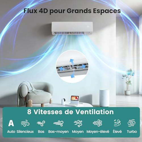 VENTILATION PERSONNALISABLE : Le flux d’air en 4 directions assure une répartition homogène dans toute la pièce. 8 niveaux de ventilation sont disponibles pour un confort personnalisé en toute simplicité. Le mode Auto adapte la vitesse, tandis que le mode Silencieux préserve votre tranquillité.