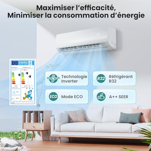 EFFICACITÉ ÉNERGÉTIQUE MAXIMALE : Froid en 30 s, chaud en 60 s. Idéal pour les espaces jusqu’à 22 m², ce climatiseur réversible mural profite à toute la famille. La technologie inverter et le mode Éco allient performance et économie d’énergie. Classe A+++ en chauffage, A++ en froid.