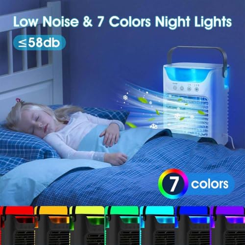 Timer de 6 heures et lumière nocturne de 7 couleurs: ce refroidisseur d’air évaporatif dispose de trois réglages de temporisateur (2H / 4H / 6H) pour l’arrêt automatique, empêchant le surrefroidissement pendant le sommeil. La lumière de nuit intégrée 7 couleurs crée une ambiance relaxante (peut être éteinte). Compact et calme, il est parfait pour les chambres à coucher, les petites pièces ou les espaces de travail