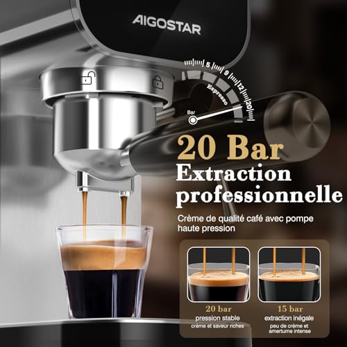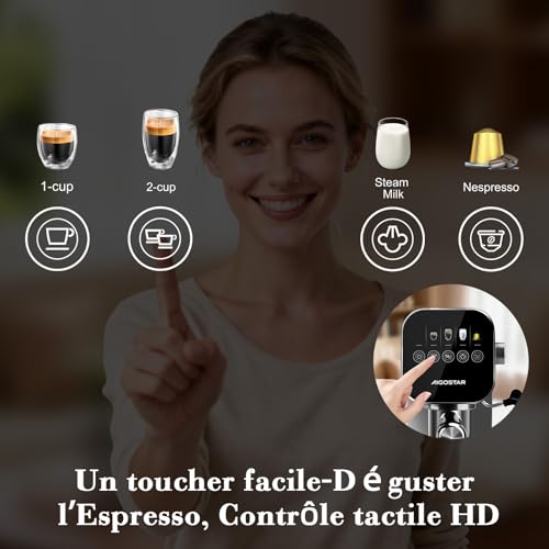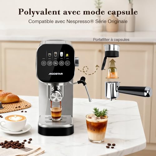 Aigostar Barista – Machine à café Expresso et Cappuccino, Compatible avec capsules et café moulu, 20 Bars, Écran Tactile Digital, 1 ou 2 tasses, Cafetiere avec mousseur à lait, 0,9 L, 1350 W, Inox