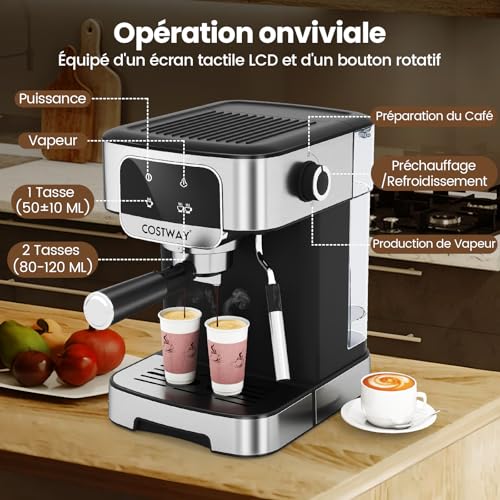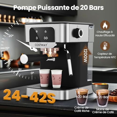 COSTWAY Machine à Espresso 20 Bars, Machine à Café Professionnelle 1200W avec Mousseur à Lait à Vapeur, Réservoir d’Eau Amovible de 1,8 L et Écran Tactile, Cafetière en Acier Inoxydable pour Barista