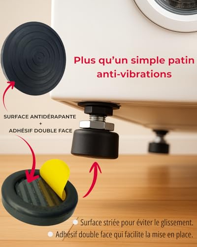 ⚫【 LOT DE 4 PATINS ANTI-VIBRATION 】: Retrouvez dans notre kit complet 4 patins anti-vibrations en caoutchouc. Idéal pour absorber et réduire la transmission des vibrations de votre machine à laver ou de votre sèche-linge, vous n’entendrez plus vos voisins se plaindre du bruit de votre appareil lorsque celui-ci est en marche. Pratique et discret, réduisez efficacement les nuisances sonores de vos appareils ménagers.