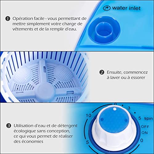 ★COMMODITE ET SIMPLICITE D’UTILISATION★Il vous suffit de régler librement le temps de lavage de 0 à 10 minutes et le temps de déshydratation de 0 à 5 minutes en fonction du nombre de vêtements. Après le nettoyage, l’excès d’eau sale s’écoulera automatiquement du tuyau de vidange. À ce stade, vous pouvez facilement ouvrir le couvercle avec poignée pour obtenir des vêtements propres à moitié secs.