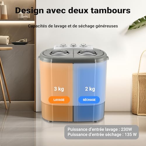 [Puissant moteur en aluminium] – La mini machine à laver est équipée d’un moteur qui lave le linge sous 230 W, qui la sèche sous 135 W et qui assure un nettoyage en profondeur des vêtements. Son fonctionnement à 220 V/50 Hz garantit une efficacité optimale pour éliminer les saletés et les taches