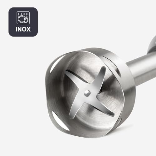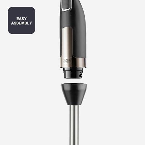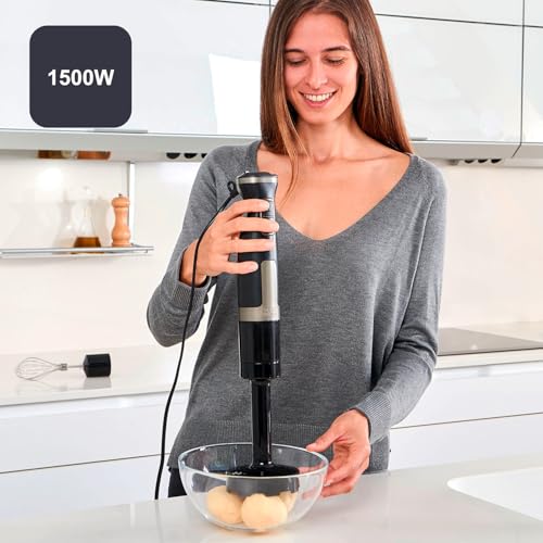 BLACK+DECKER BXHBA1500E – Mixeur plongeant multifonction 4 en 1 1500W, 20 vitesses + Turbo, anti-éclaboussures, verre doseur, bol hachoir, fouet et presse purée, noir et inox anti-traces de doigts