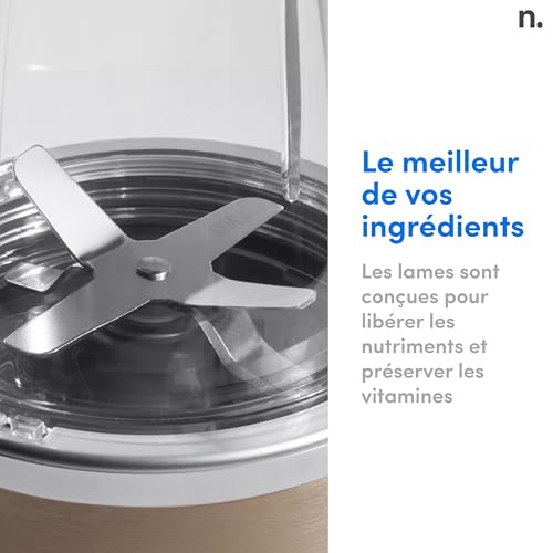 Ce personal blender compacte et optimisé de 900 Watts transforme tout les aliments, des fraises aux épinards, en préparation nutritive