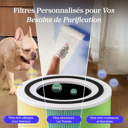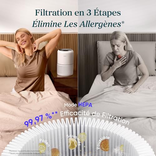 3 É𝒕𝒂𝒑𝒆𝒔 𝒅𝒆 𝑭𝒊𝒍𝒕𝒓𝒂𝒕𝒊𝒐𝒏: Core 300 élimine particules d’allergènes, pollen, acariens, tabac, poussières par HEPA Filtre, fonctionne avec un préfiltre ultra-fin et un filtre à charbon actif, pour les propriétaires d’animaux, les fumeurs, l’asthme, les allergies et les enfants