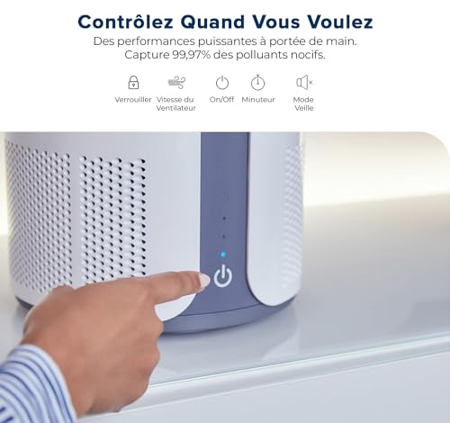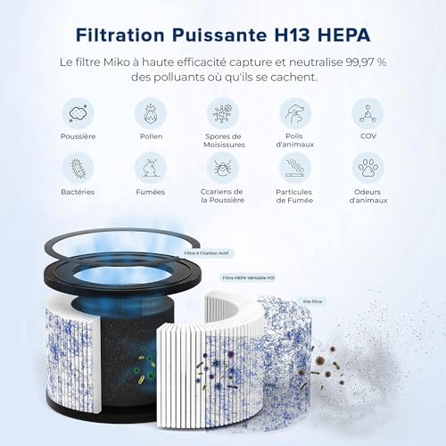 Spécification: MIKO, purificateur d’air HEPA couvrant jusqu’à 86 m2, 3 vitesses de ventilateur, minuterie intégrée, CADR de 150, mode veille – Le filtre True HEPA H13 élimine 99,97% de la fumée et du pollen