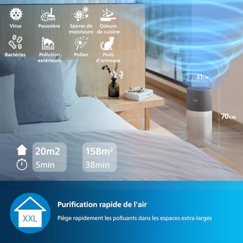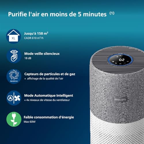 Le purificateur d’airde la séries 2000 de Philips est un purificateur d’air HEPA grande pièce (jusqu’à 158 m²) Des capteurs intelligents détectent la qualité de l’air en temps réel, de sorte que le purificateur d’air peut l’afficher et régler de manière intelligente la bonne vitesse pour votre maison D’une seule touche, il filtre les poussières fines, les germes invisibles, les allergènes et les polluants de votre maison avec un débit d’air pur (CADR) de 610 m3/h Le purificateur d’air maison économe en énergie et en coûts, utilisant l’énergie équivalente à celle d’une ampoule électrique standard. Il purifie une pièce de 20 m² en moins de5 minutes