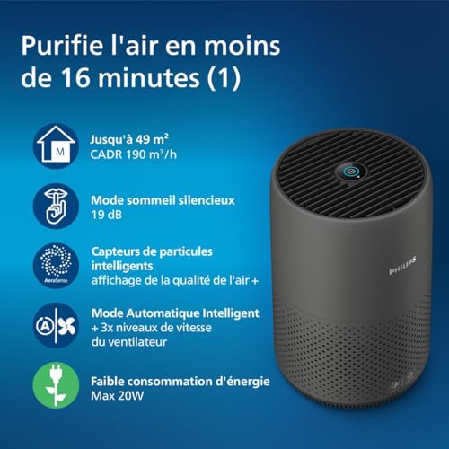 Purificateur d’Air Compact Philips 800i Series, 49m2, Filtre HEPA & Filtre à Charbon Actif, Élimine Jusqu’à 99,5% Des Virus Et Aérosols De l’Air (1), Noir (AC0850/11)