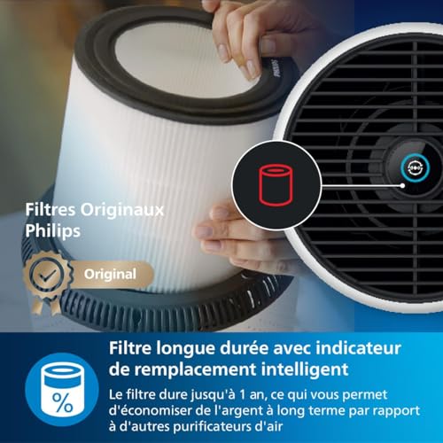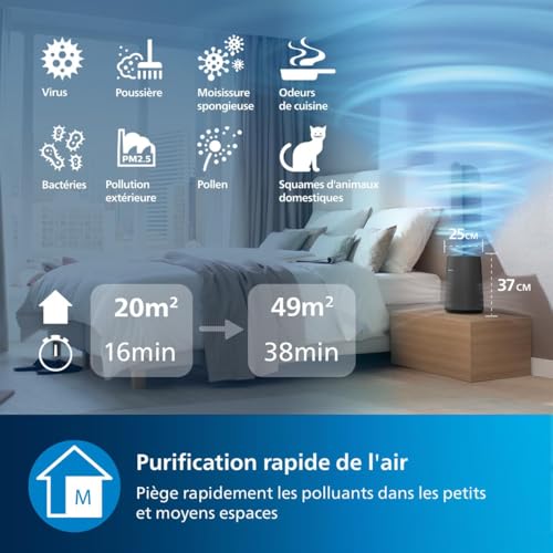 Purifie l’air en moins de 16 min (1) Élimine 99 % des virus, allergènes et polluants (2, 3, 6) D’une simple pression sur un bouton, le purificateur d’air filtre les virus, allergènes et polluants invisibles de votre intérieur, pour un air pur et sûr. Il purifie rapidement et efficacement grâce à un CADR (Clean Air Delivery Rate ou débit d’air pur) de 190 m³/h.