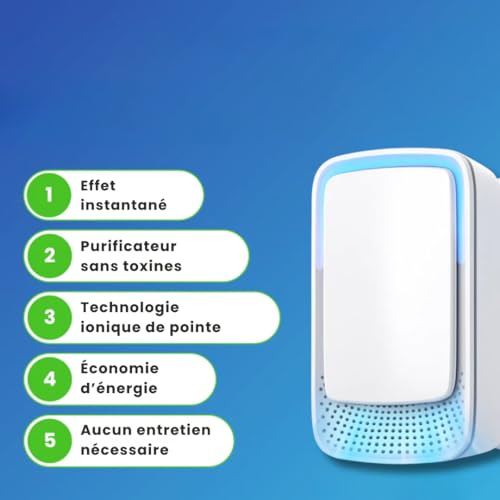 【Plug and Play & Écoénergétique 】 Il suffit de brancher ce purificateur d’air pour qu’il fonctionne immédiatement, sans installation compliquée. Lorsque le mini générateur d’ion négatif fonctionne, une lumière LED bleue s’allume et il y a un léger bourdonnement (phénomène normal lié à l’émission d’ions négatifs). La prise est conçue pour consommer peu d’énergie et offrir plus de sécurité.