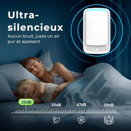 【Fonctionnement silencieux】Le bruit de ce purificateur d’air est inférieur à 30 décibels, pratiquement silencieux en fonctionnement. Il est particulièrement adapté aux bébés et aux personnes âgées. En libérant des ions négatifs, il peut réduire le stress et la fatigue, améliorer le sommeil et la concentration. Il fournit de l’air de qualité en permanence et crée un périmètre de protection personnel.