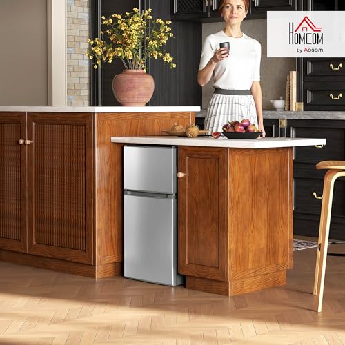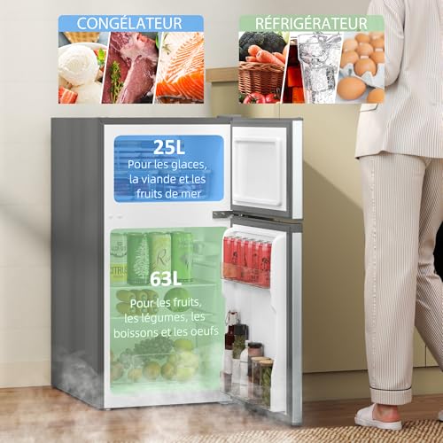 HOMCOM Réfrigérateur congélateur 88 L, Mini frigo 25L+63L, silencieux, 2 portes réversibles, éclairage, étagères amovibles, thermostats réglables, pelle et bac à glace, gris