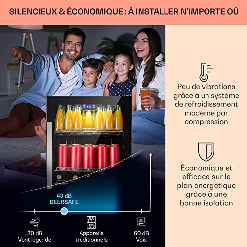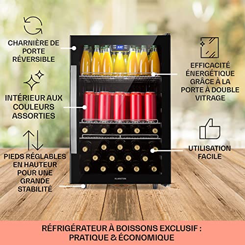 Klarstein Mini Frigo de Chambre et Bureau pour Boisson, Petit Frigo Silencieux, Refrigerateur Mini Bar 147L, Petit Réfrigérateur Camping, Frigo a Boisson, Étagères Réglables pour le Vin, Cannette, Beer Fridge, 0-20°C. Imaginez que vous puissiez vous détendre un jour d’été avec suffisamment d’alcool pour un grand match ou une réunion de famille. Ce réfrigérateur Klarstein Beersafe 5XL vous permet d’avoir suffisamment d’espace pour vos boissons. D’une capacité de 147 litres, ce frigo de bureau peut contenir de la bière, vin, cannettes, champagne, boissons non alcoolisées.. Un design irrésistible à l’intérieur comme à l’extérieur Avec sa finition en acier inoxydable et ses larges portes vitrées panoramiques, ce mini frigo chambre est aussi éblouissant que séduisant. Les boissons sont mises en scène par des lumières LED intérieures et sont gardées au frais grâce à un réfrigérant R600a écologique et efficace, qui est réputé pour sa faible consommation d’énergie et sa puissance de charge. Caractéristiques du produit : Mini réfrigérateur compact et peu encombrant Stocke les bières, les vins, les boissons non alcoolisées et bien d’autres choses encore Porte vitrée panoramique à double isolation avec cadre en acier inoxydable Réfrigérant R600a respectueux de l’environnement Pieds réglables en hauteur pour compenser les inégalités du sol Contenu de la livraison : 1 x Mini-réfrigérateur 3 x Etagères Manuel d’utilisation multilingue Dimensions : Dimensions : 55 x 84 x 60,5 cm (LxHxP) Dimensions intérieures : 47 x 54 x 44,5 cm (LxHxP) Dimensions intérieures (compartiment inférieur) : 47 x 19 x 30,5 cm (LxHxP) Poids : 34 kg Alimentation électrique : 220 – 240 V~ | 50 Hz