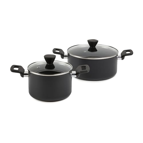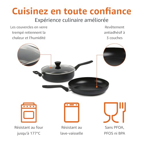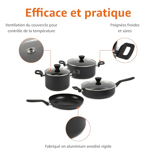 Amazon Basics Lot de 10 ustensiles, casseroles et poêles, empilables, anodisés, non adhésifs, gain de place, sans PFOA, Noir