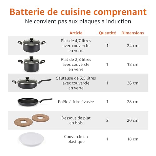 Contenu : Cocotte 17,8 cm (2,8 l) avec 1 couvercle en verre et 1 en plastique ; cocotte 24 cm (4,7 l) avec couvercle en verre ; sauteuse 26 cm (3,5 l) avec couvercle en verre ; poêle 28 cm ; 2 dessous-de-plat en bois