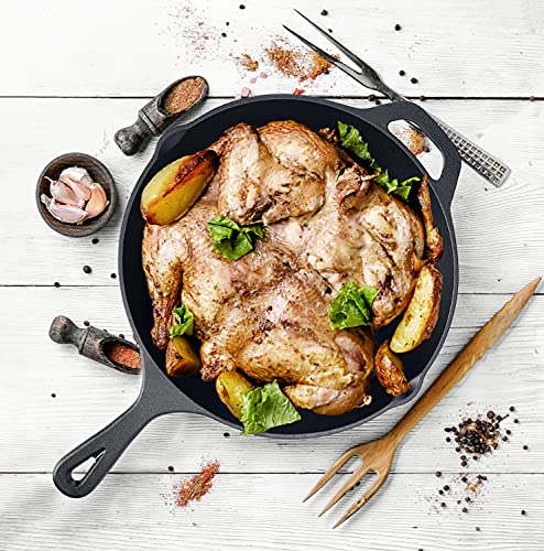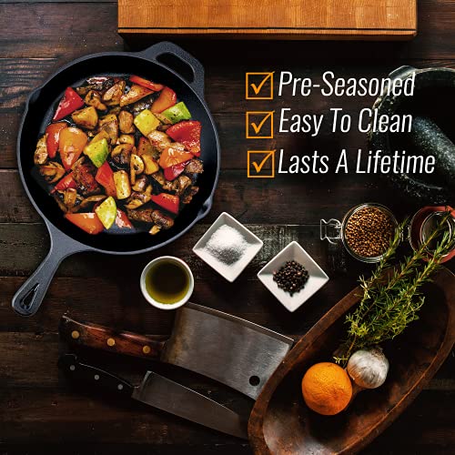 POLYVALENT, DURABLE ET DURE UNE VIE (3,7 KG) AVEC DOUBLE BEC VERSEUR – La poêle / poêle à frire peut être utilisée pour saisir, frire, sauter, flamber, griller, rôtir, cuire, braiser, griller et cuire lentement. Peut également être utilisé comme poêle à pizza de 12 pouces grâce à la poignée et à l’aide de sécurité en silicone. Fabriquée à partir de fonte durable pour une rétention de chaleur, une conductivité et une résistance supérieures inégalées, la poêle / poêle à frire vous permet de cuire les aliments doucement et uniformément pour garder les aliments au chaud plus longtemps.
