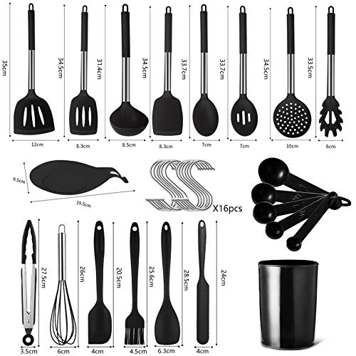 【Ensemble d’ustensiles de cuisine professionnels en silicone】 L’ensemble de cuisine contient 15 ensembles d’ustensiles de cuisine en silicone en acier inoxydable + 1 ensemble de 5 tailles de cuillères à mesurer noires + 1 coussinet de cuillère noir + 16 crochets en forme de S,l’ensemble de 15 pièces comprend une spatule,une spatule,porte-aliments,fouet + passoire + cuillère,cuillère dense + cuillère à soupe,oreiller cuillère,spatule,etc,répondent à vos divers besoins de cuisine .