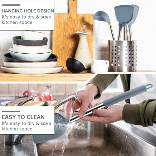 Pratique et peu encombrant : cet ensemble d’ustensiles de cuisine flexibles couvre vos besoins quotidiens en cuisine. (Offrez 4 crochets en cadeau) Les poignées avec boucles de suspension intégrées facilitent le rangement et gardent votre comptoir bien rangé – le cadeau parfait pour Noël, les anniversaires ou les pendaisons de crémaillère.