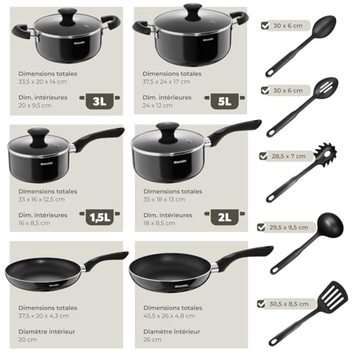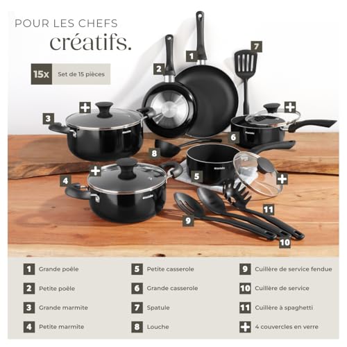 COMPLET ET PRATIQUE, CET ENSEMBLE DE BATTERIE DE CUISINE DE 15 PIÈCES est votre compagnon idéal en cuisine. Composé de 2 poêles, 4 casseroles avec couvercles en verre et 5 ustensiles de cuisine essentiels, il vous permet de réaliser toutes vos recettes préférées. Vous allez adorer la répartition uniforme de la chaleur grâce aux fonds spiralés, parfait pour une cuisson homogène à chaque fois. Fini les repas brûlés, bonjour la perfection culinaire!