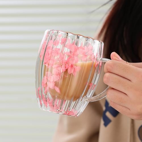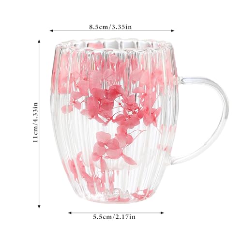 Gitekain Cups With Dried Flowers, 300ml Double Walled Coffee Cup, Clear Coffee Cup With Handle, Double-Walled Beverage Glasses, Drinking Cups For Hot Cold Drinks, Glass Cups With Floral Design