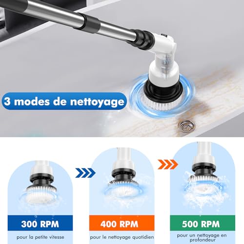3 modes brosse nettoyage salle de bain : l’épurateur électrique offre trois réglages de vitesse : faible à 300 tr/min (pour les surfaces sensibles), moyen à 400 tr/min (pour le nettoyage quotidien) et élevé à 500 tr/min (pour les taches tenaces). Ces choix vous permettent de choisir la méthode de nettoyage la mieux adaptée à vos besoins pour traiter efficacement les différents niveaux de contamination et ainsi gagner du temps