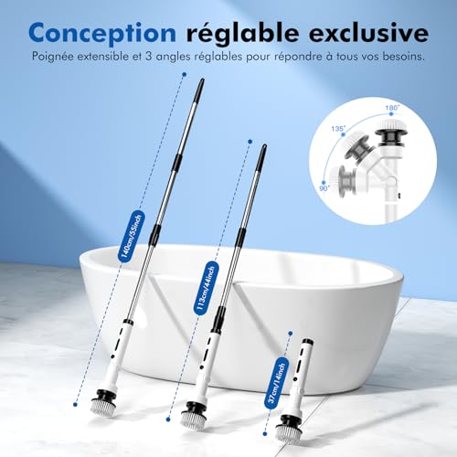 37-140CM brosse de nettoyage electrique: Brosse Nettoyage Electrique La poignée réglable de 14 à 55 pouces facilite l’entretien des surfaces de cuisine et de la salle de bain. Sa longueur plus courte est parfaite pour les éviers, les cuisinières et les plans de travail, tandis que sa longueur plus longue permet un nettoyage en profondeur des baignoires, des joints de carrelage et des coins difficiles d’accès