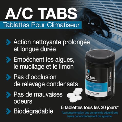 A/C TABS : 40 TABLETTES pour GARDER LE CLIMATISEUR et l’ÉVACUATION DES CONDENSATS EFFICACES ET PROPRES ; ÉLIMINENT ET PRÉVENTENT la formation d’algues, de mucilages, de limon et de MAUVAISES ODEURS ; ACTION LONGUE DURÉE : insérer 5 tablettes équidistantes dans le split après chaque nettoyage, remplacer tous les 30 jours en cas d’usure