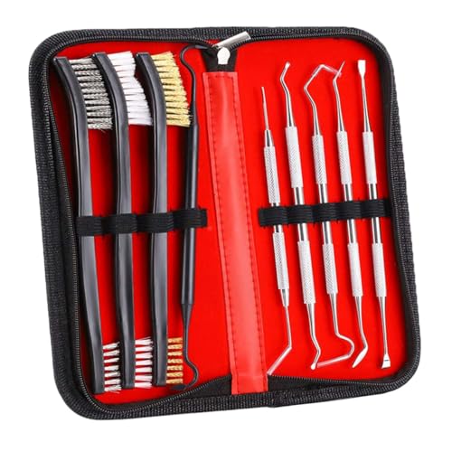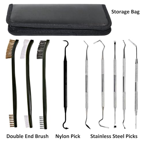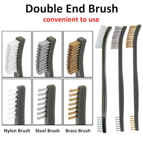 【 Contenu de l’emballage 】 1 brosse en laiton à double extrémité, 1 brosse en acier à double extrémité, 1 brosse en nylon à double extrémité, 5 pics de nettoyage pour pistolet en acier inoxydable, 1 pic de nettoyage pour pistolet en nylon, 1 boîte de rangement.